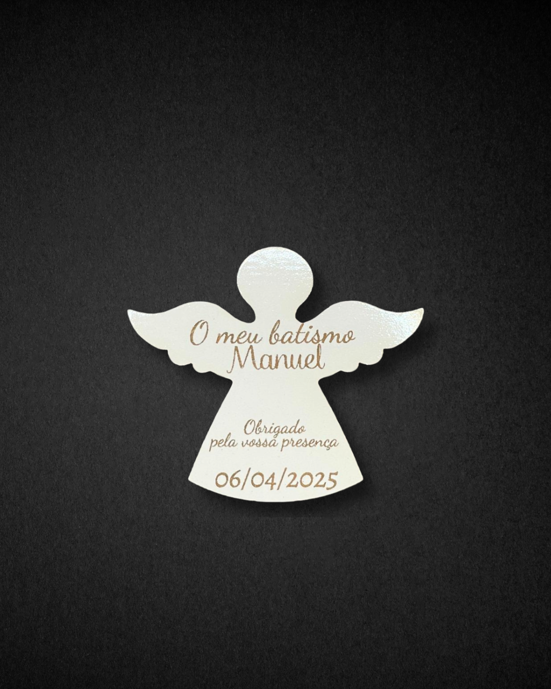 Feito em materiais de alta qualidade, o anjo apresenta um design delicado e simbólico, podendo ser personalizado com nome e data do evento, transformando-se numa recordação especial para padrinhos, familiares e convidados.