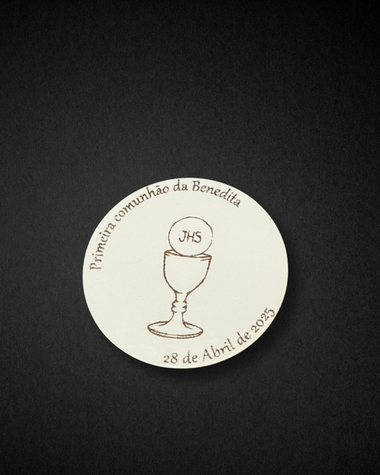 Lembrança redonda com cálice para Batismo/ Comunhão/ Profissão de fé