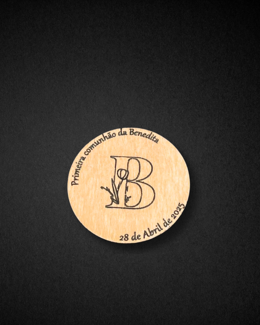 Lembrança redonda com letra Batismo/ Comunhão/ Profissão de fé
